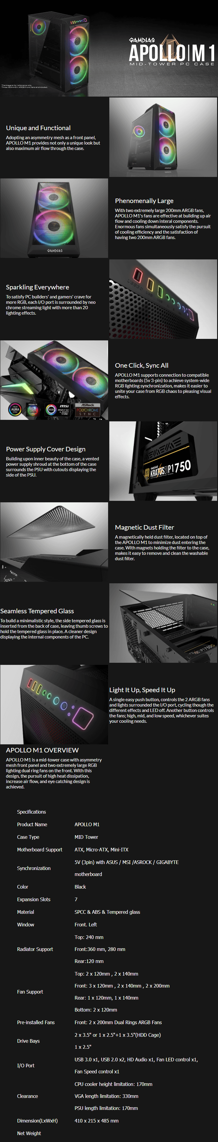 Gamdias APOLLO M1 Tempered Glass Gaming Case / 200mm Dual Rings ARGB Fans / ARGB Streaming Lighting / Power Cover Design / Magnetic Dust Filter / Easily Switch RGB Streaming Lighting Style / Selectable High/Mid/Low Fan Speed / APOLLO M1